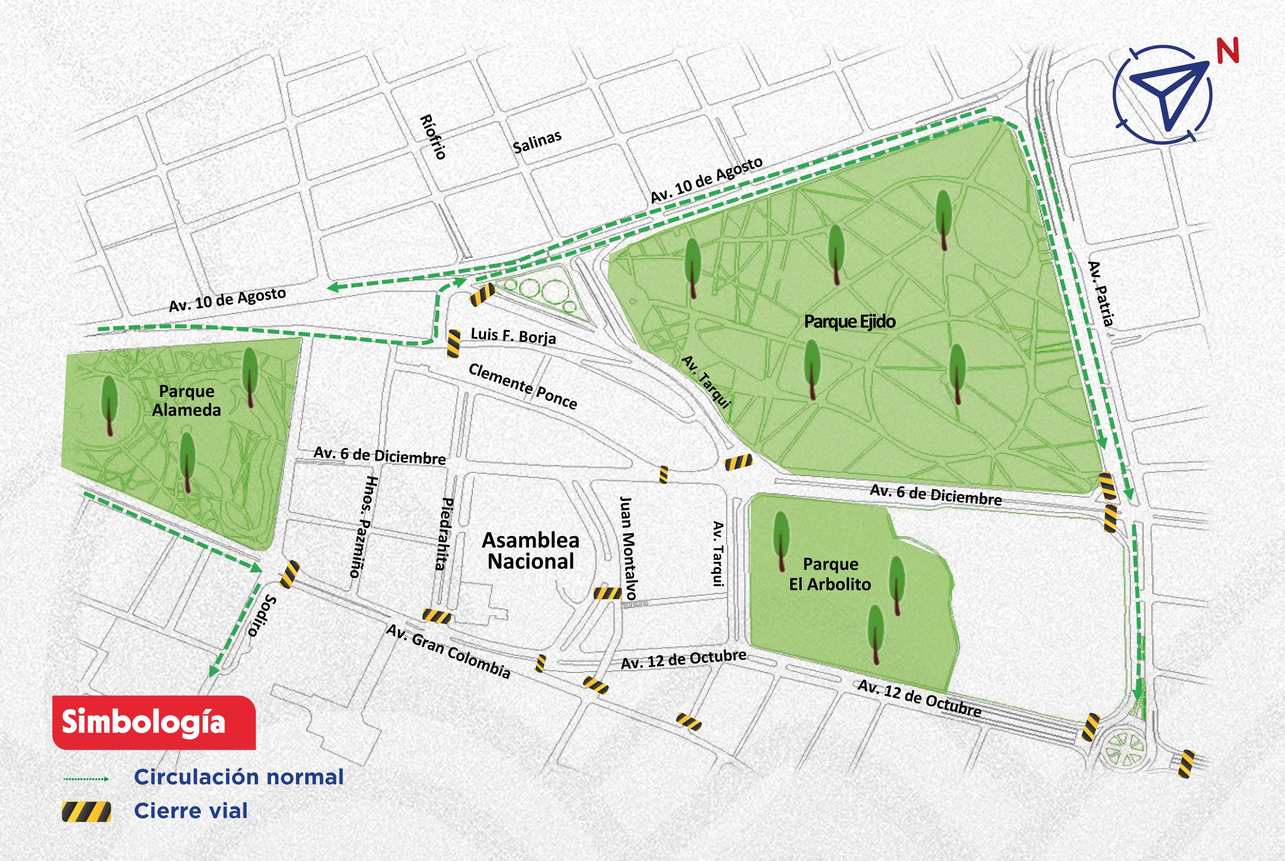 Cierres por movilizaciones – Parque El Ejido Av. Patria y 12 de Octubre y Av. 10 de Agosto y Bogotá,11:01,Parque El Ejido Av. Patria y 12 de Octubre y Av. 10 de Agosto y Bogotá,Circulación vehicular y presencia de peatones ,La circulación vehicular se mantiene con normalidad,Av. Mariscal Sucre, av. Velasco Ibarra ,Respetar el paso preferencial de peatones,Gestión de tránsito, monitoreo de cierres viales, informar a conductores sobre rutas alternas, control de transporte público y gestión peatonal para cruces seguros